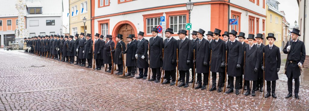 Kurz nach 9 Uhr ist Antreten am Marktplatz. Unter Musikbegleitung wird dann in voller Montur mit Gehrock, Zylinder und Gewehren in die Kirche marschiert.