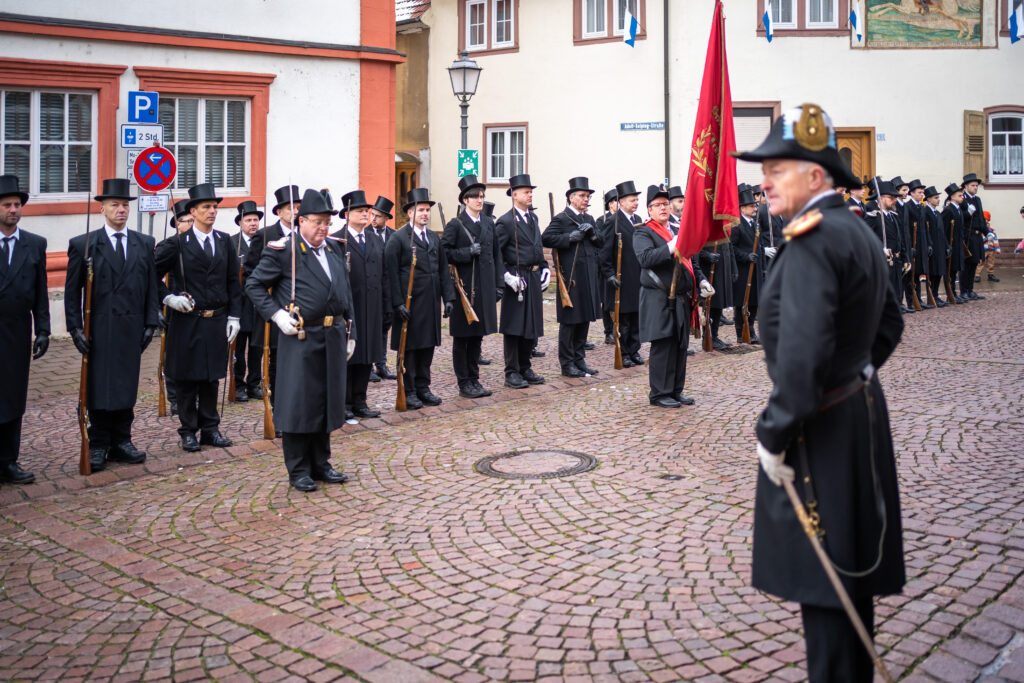 Kurz nach 9 Uhr ist Antreten am Marktplatz. Unter Musikbegleitung wird dann in voller Montur mit Gehrock, Zylinder und Gewehren in die Kirche marschiert.